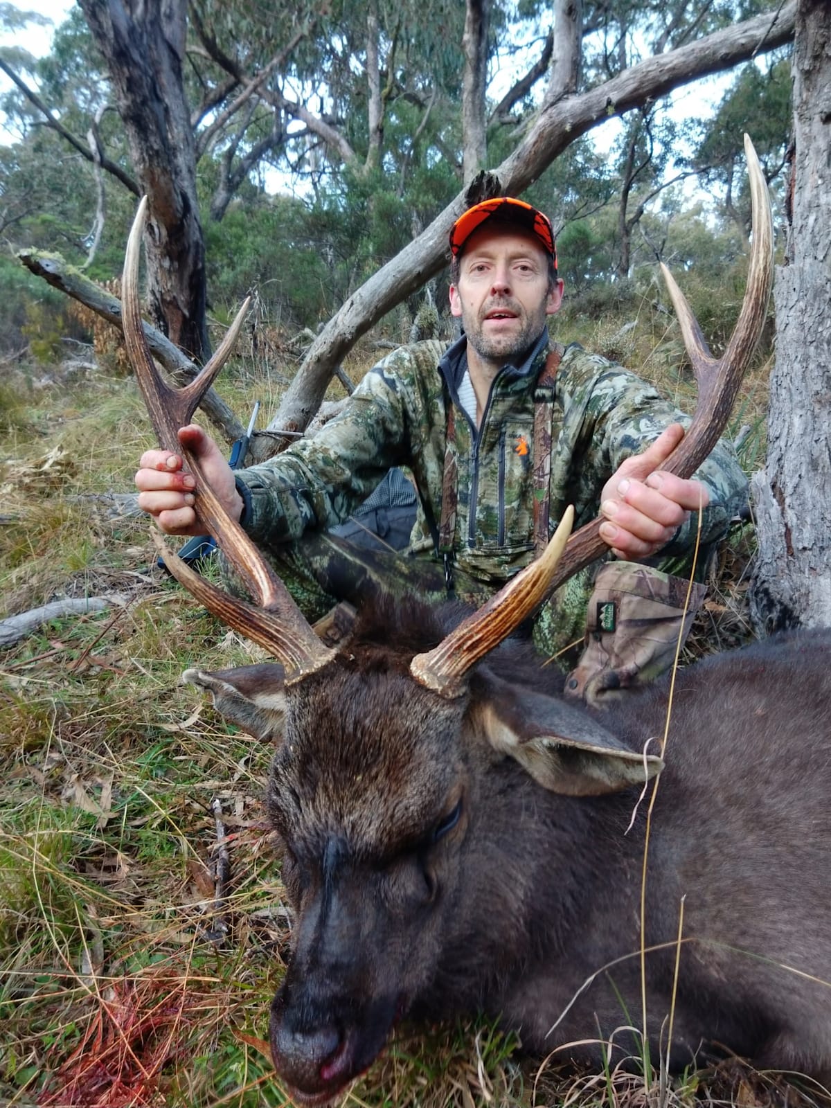 Then out he came at 213m and side on! After Brett took the shot the stag took off, running 30m before he dropped out of sight. We waited the obligatory few minutes for the shot to take effect and then made our way down the face, across the very cold river, and up the other side - and there he was, right where he had dropped out of sight. The stag sported a very nice 28” x 32” wide set of antlers. We took some photos, did the knife work and continued on hunting.
