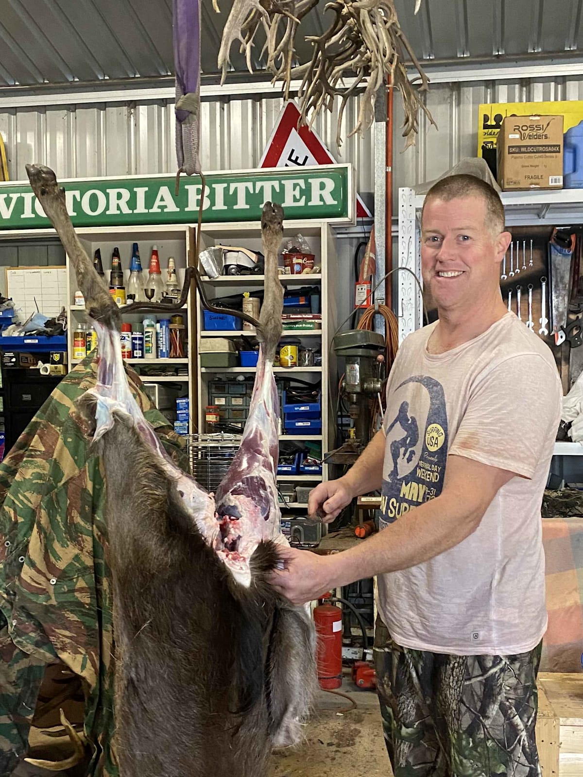 We loaded the car and headed back to Tobies’ shed where we hung up the yearling and went to work butchering. Then Tobie handed me a hand saw and said “You get to cut it in half”. I steadied with one hand and cut with the other, while Tobie steadied and kept my sawing aligned by telling me if I was going off line. Note to self: buy a reciprocating saw. We finished breaking the beast down, threw it all in my big Esky and I set off home with a big smile on my face, thinking “I can’t wait to eat all this meat so I can go hunting again”.