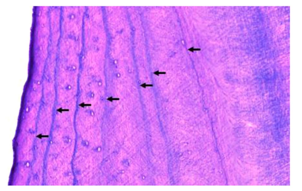 Histology of an incisor tooth from a sambar shot in Victoria, Australia, in 2018, with seven cementum annuli, with confidence level A, indicated by arrows (Image by Matson’s Laboratory, Manhattan, Montana, USA).