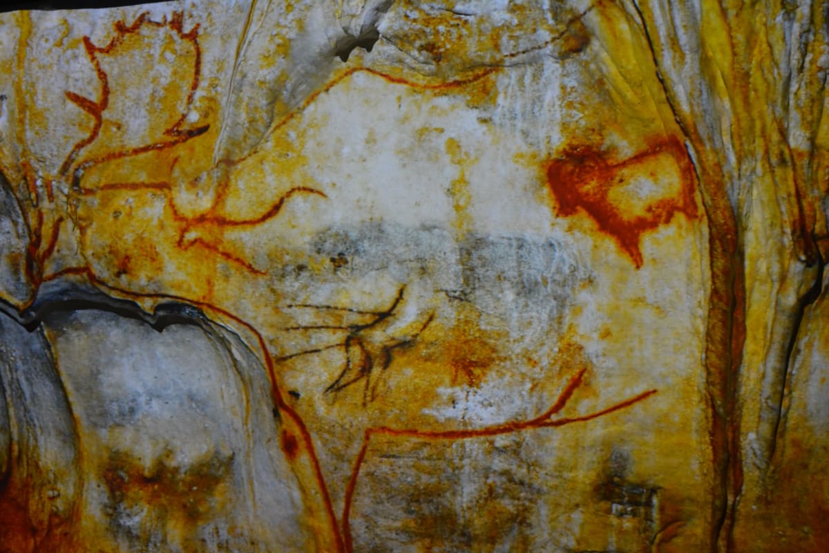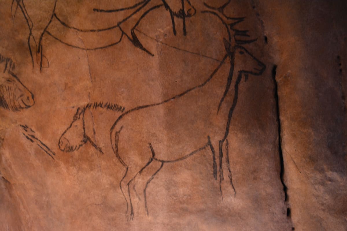 A depiction of an Iberian red deer. The lines of the drawings are simple, elegant, but are to scale and the drawings look anatomically correct. Analysis indicated that each line was often a single stroke indicating that they had practiced the drawing before going into the cave to do it