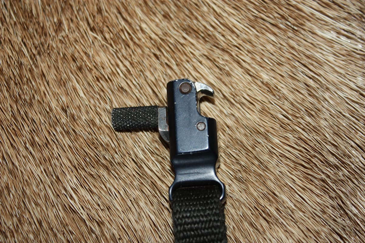 Trigger type release aid. The hook on the right holds the D-loop until released by the trigger on the left. This style also has a wrist strap not pictured.