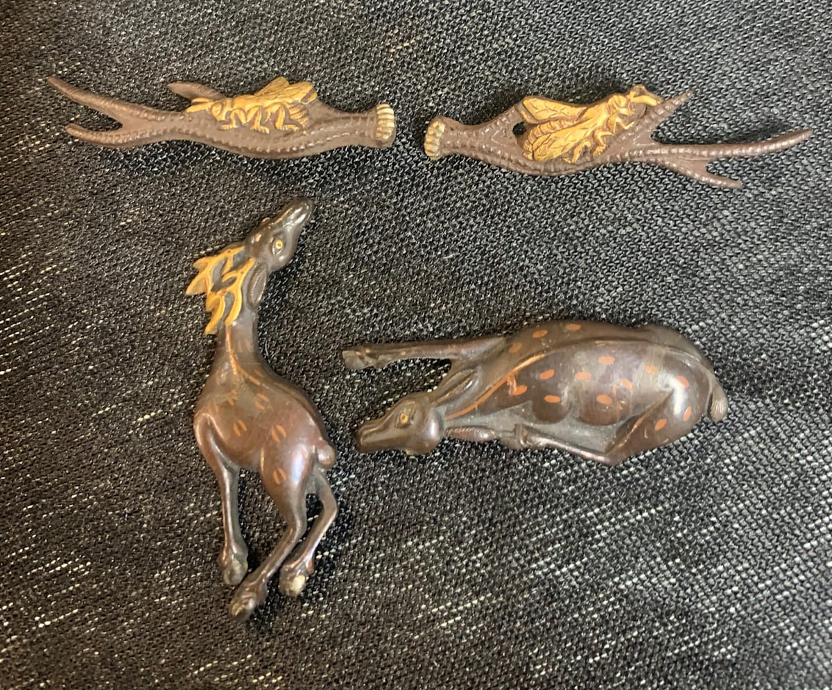 Menuki are small figurines that are placed under the wrap on the handle of a Japanese sword. These ones were from the sekibun school 200 years ago. They are about 2cm long and finely detailed. Note the deer print spots on the deer on the left.