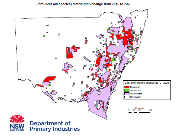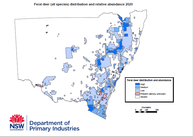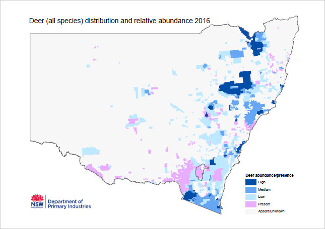 This data is available from the DPI, showing that, for the most part, across NSW, where deer are present, their abundance is low. Comparing the relative abundance of deer between 2016 and 2020, the minimal change in the high-density abundance of deer suggests that their current management is proving effective.